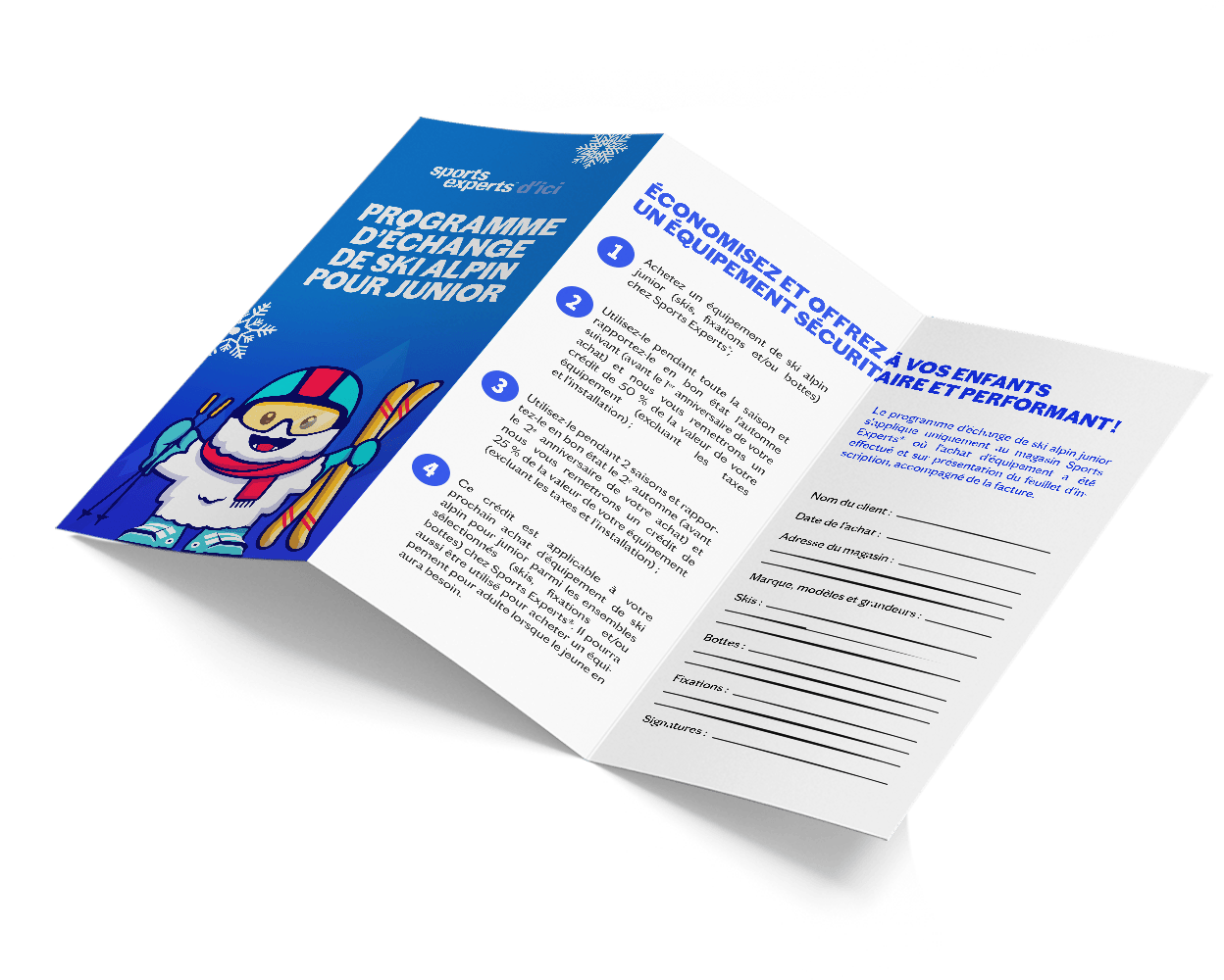 The kids Alpine Exchange Program is only applicable at the Sports Expert location where the equipment was purchased, while inventory is available and upon presentation of the registration form and your receipt.