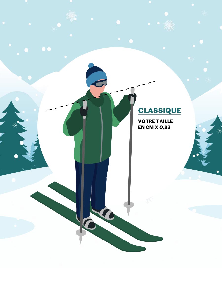 To choose the length of the poles, the use of tried-and-tested formulas is often recommended. For example, for classic skiing, multiply your height (in metres) by 0.83 - which generally corresponds to shoulder height - and by 0.89 for skating skiing.