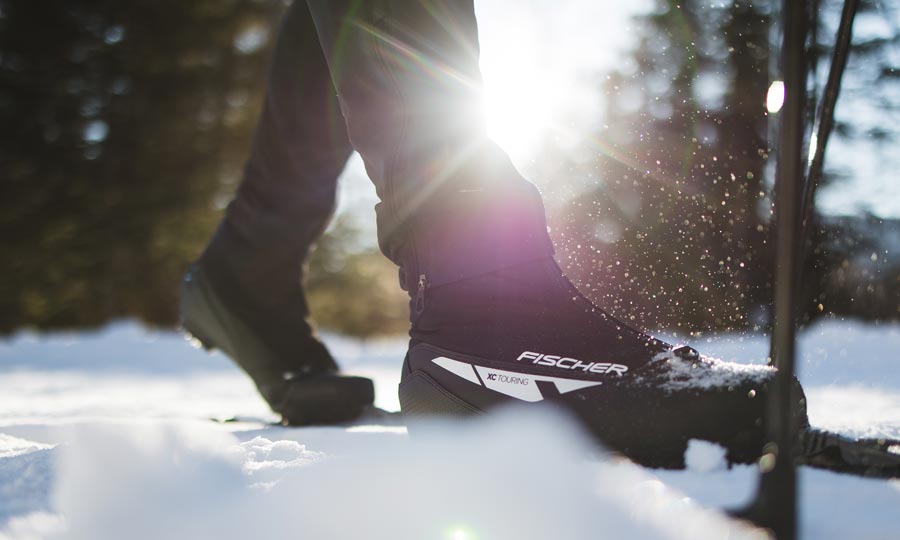 When choosing boots for touring cross-country skiing, look for a model with good insulation, durable fabric and gaiters to protect your feet from the powdery snow on ungroomed trails.