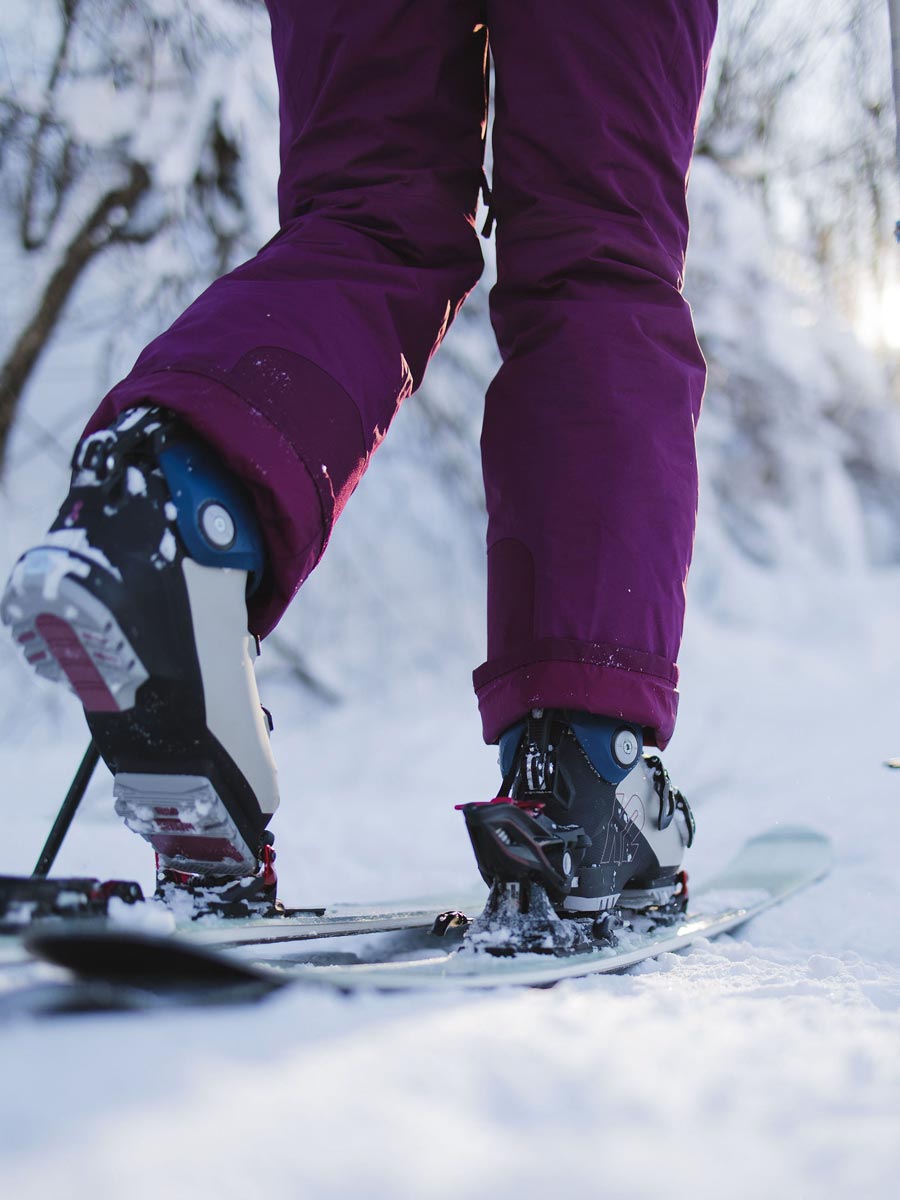 Take an exploratory tour of alpine touring boots. Different from conventional alpine ski boots, they’re lighter and come equipped with technologies that enable you to walk comfortably on the mountain. In fact, alpine touring ski boots have a collar that you can unfasten to give you a greater range of moption when you walk.