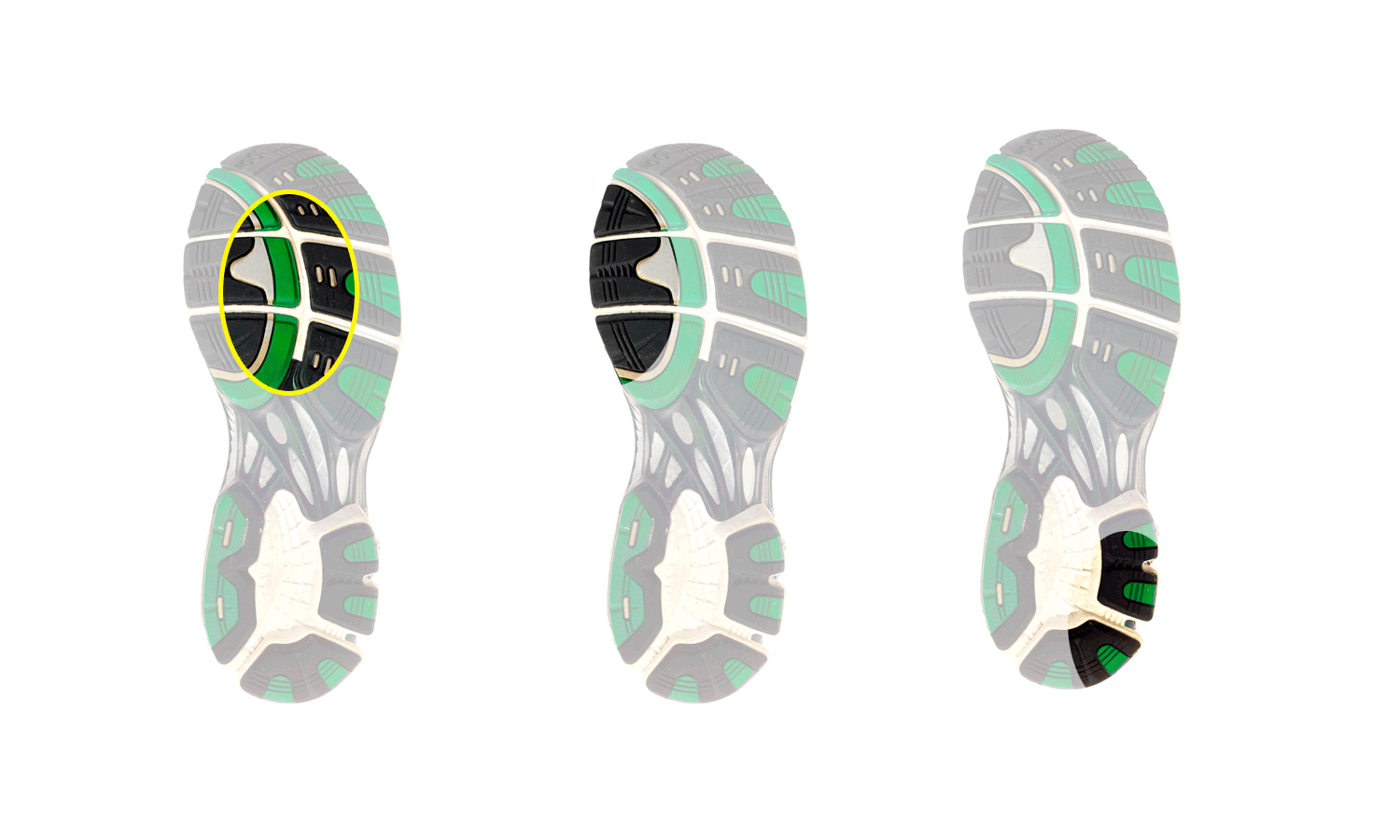 The outsole is mostly worn in the centre (see illustration). This indicates a neutral stride (slight pronation). A universal or neutral running shoe that is comfortable and adapted to your weight will be suitable in most cases.