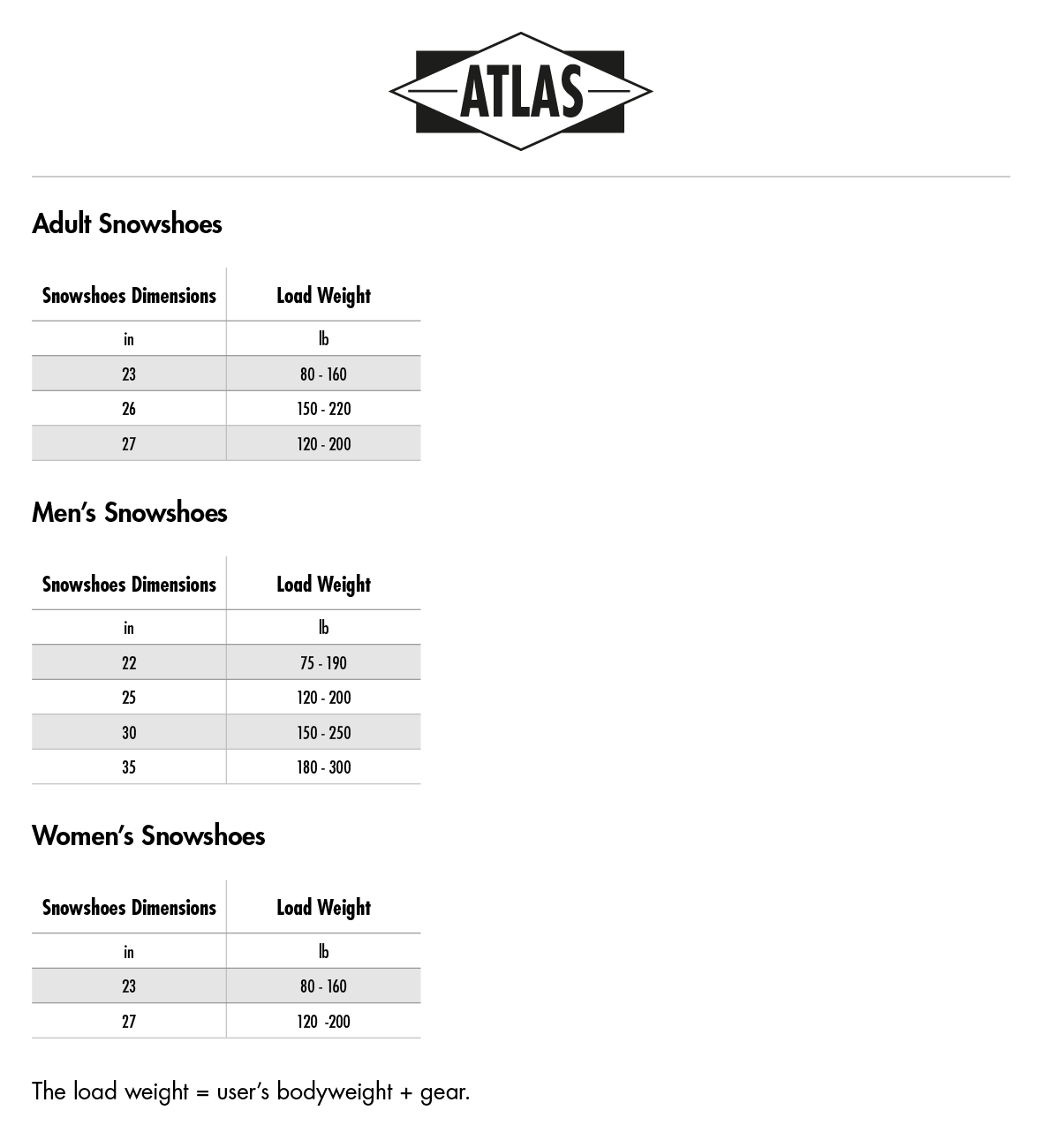 Load weight: 120 lb to 200 lb (user and gear)