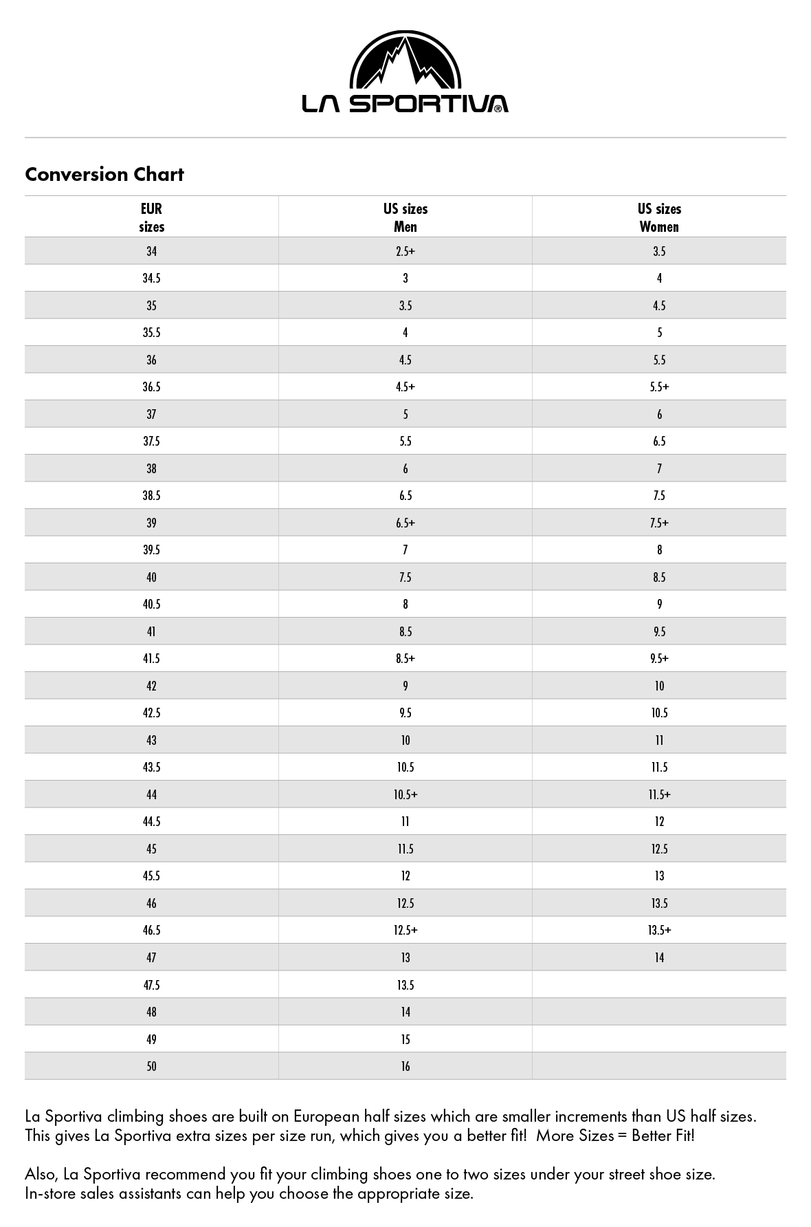 • La Sportiva recommend you fit your climbing shoes one to two sizes under your street shoe size.