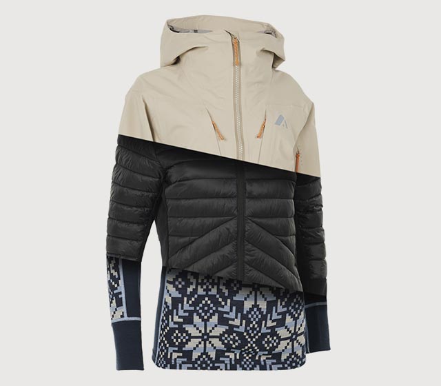 Layering system consisted of 3 types of clothing providing comfort and protection during outdoor activities.